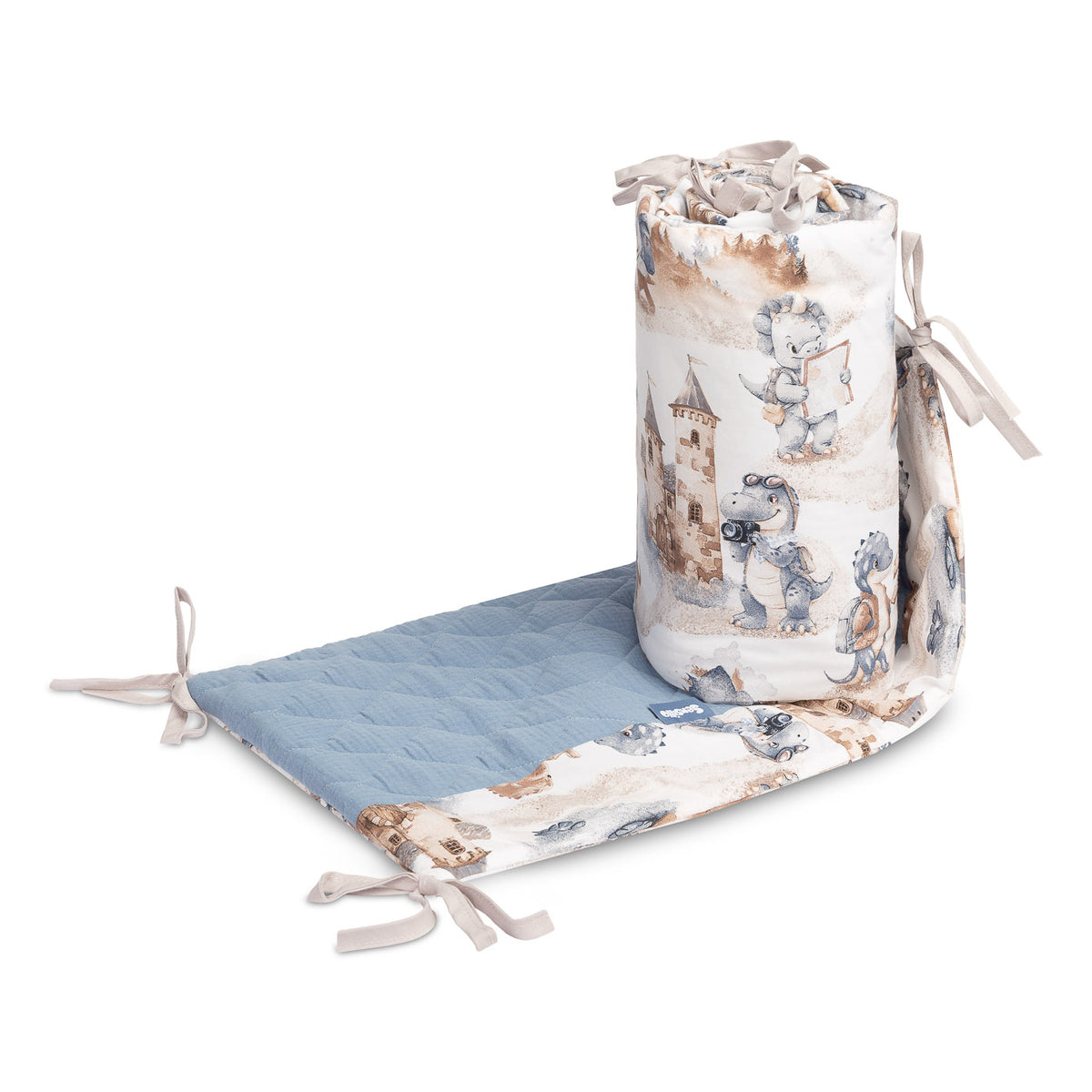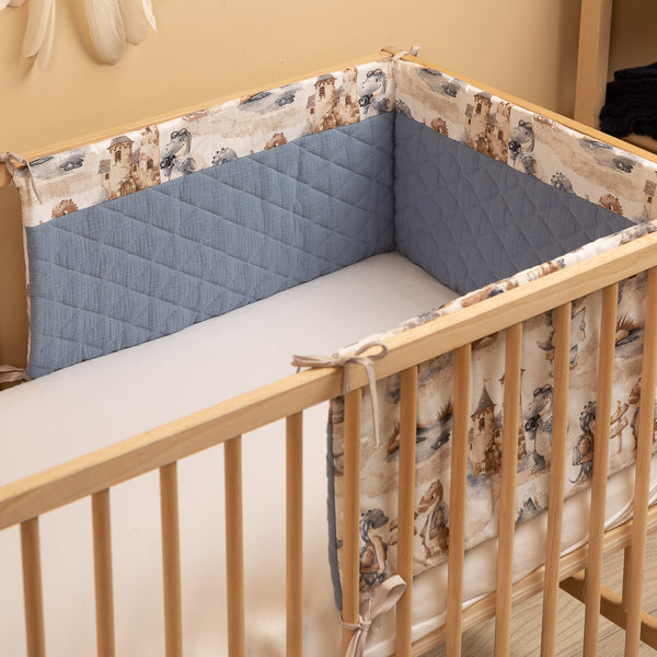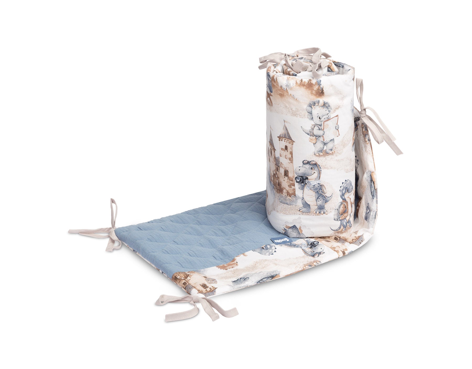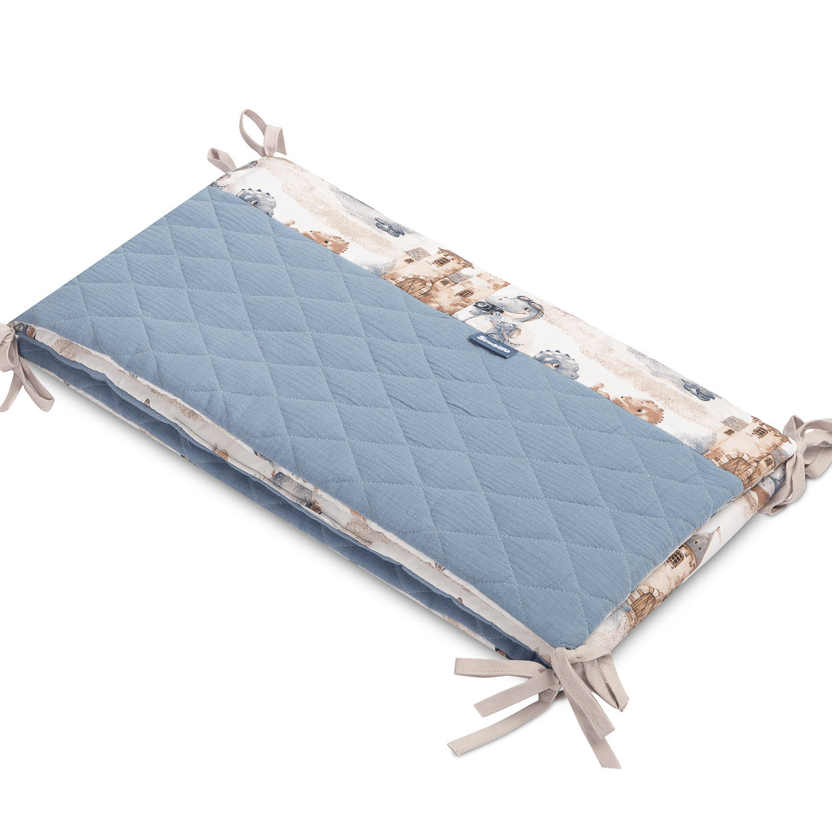 Ochronny brzeg do łóżeczka pasuje do każdego standardowego łóżeczka dziecięcego. Brzeg wykonany jest z miękkiej drukowanej bawełny i przyjemnego w dotyku muślinu. Wypełnienie z poliestru ochroni dziecko przed urazami podczas poruszania się po łóżeczku. Brzeg pozostaje na swoim miejscu dzięki paskom, którymi mocuje się do szczebelków łóżeczka. Przeznaczony jest do łóżeczka o wymiarach 120x60 cm. Brzeg będzie doskonałym dodatkiem do wyposażenia dziecięcego.
