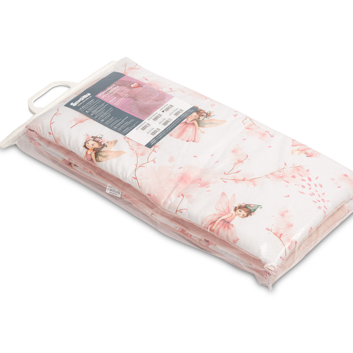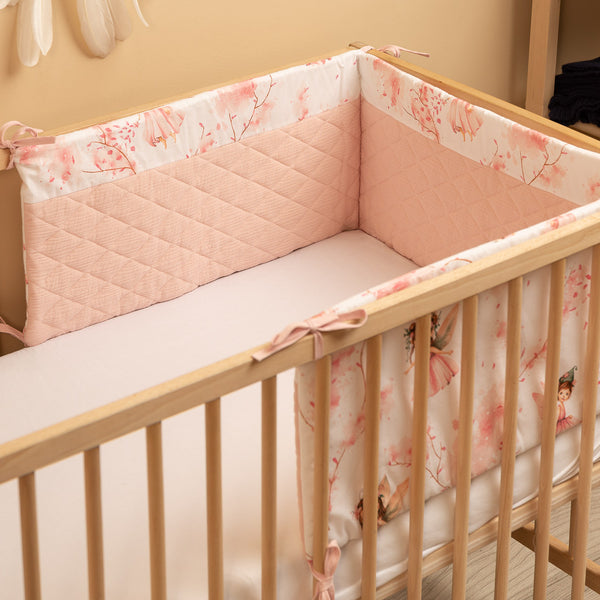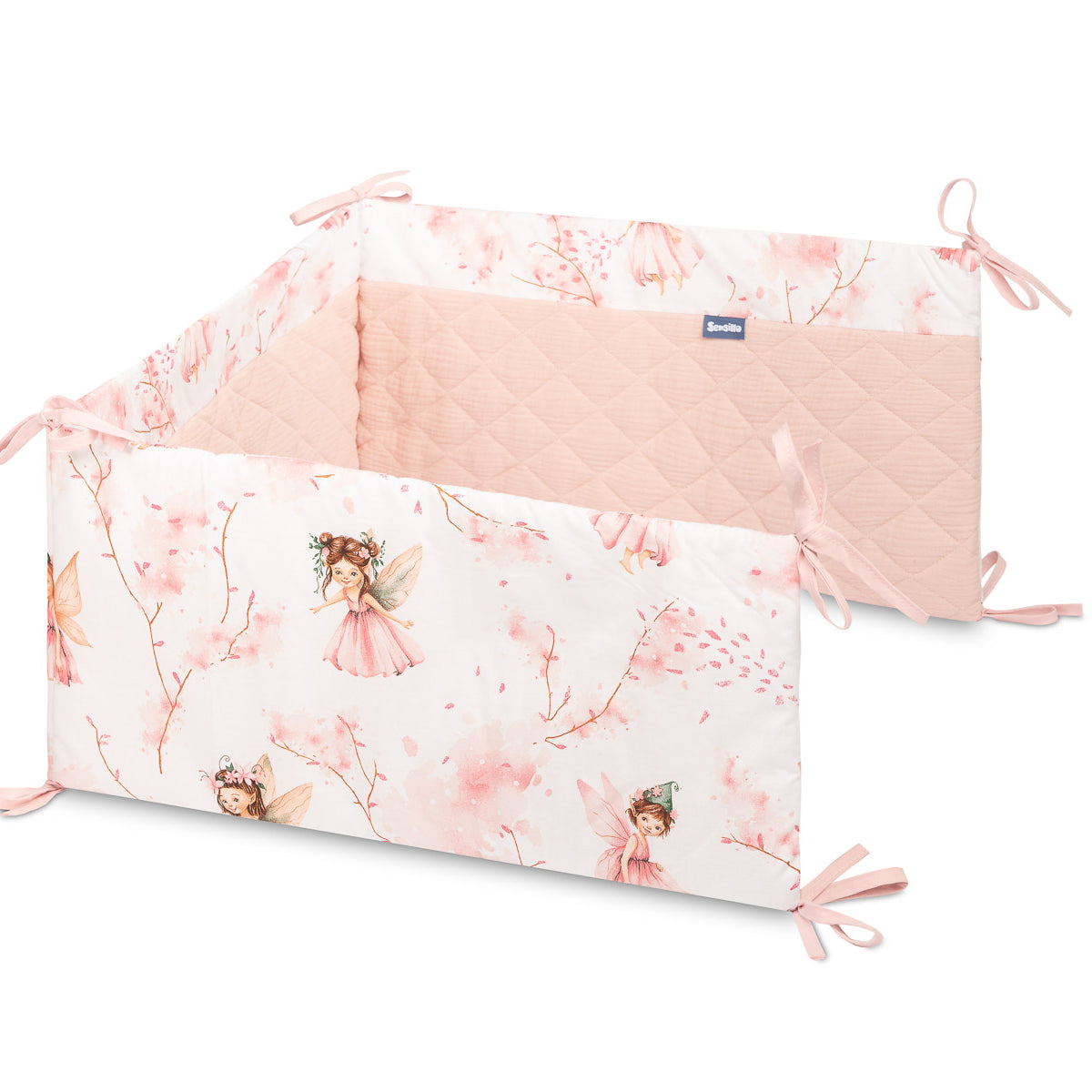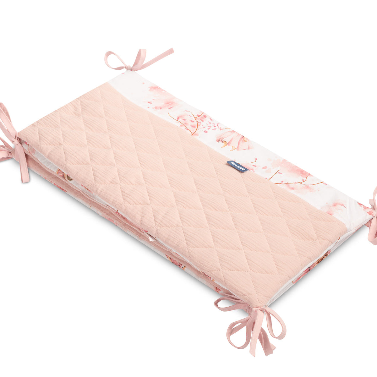 Ochronny brzeg do łóżeczka pasuje do każdego standardowego łóżeczka dziecięcego. Brzeg wykonany jest z miękkiej drukowanej bawełny i przyjemnego w dotyku muślinu. Wypełnienie z poliestru ochroni dziecko przed urazami podczas poruszania się po łóżeczku. Brzeg pozostaje na swoim miejscu dzięki paskom, którymi mocuje się do szczebelków łóżeczka. Przeznaczony jest do łóżeczka o wymiarach 120x60 cm. Brzeg będzie doskonałym dodatkiem do wyposażenia dziecięcego.